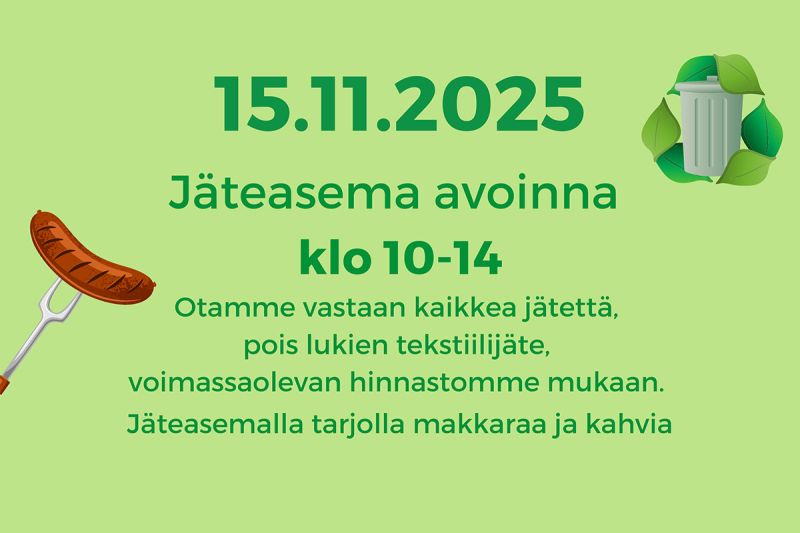 Veloituksetta voit tuoda esim. SER-jätteet, paperin, pahvin, metallin jne. Jäteasemalla tarjolla makkaraa ja kahvia.
